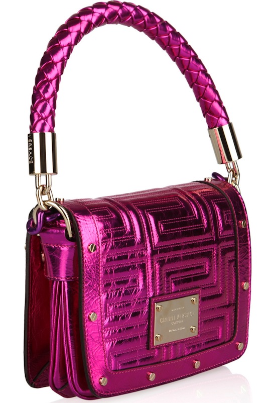 Versace does it again with another dazzling, show stopping creation. Their new metallic leather bag will definitely draw the right attention when worn at any social event. Both the metallic fuchsia and gold shoulder bags showcase signature palazzo pattern amongst silver nailhead details. The fuchsia bag has a fold-over flap with snap fastening, braided handle as well as a chain should strap, and two inner pockets. Whereas the gold metallic bag has a chain and leather shoulder strap, zipper closure on the top, and one inner pocket. Either bag would go great with a little black cocktail dress.